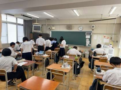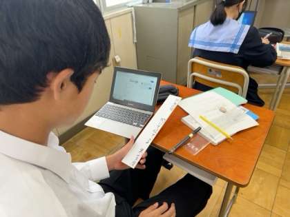 自作の俳句を短冊に筆ペンで認める取組をしています。文化祭に出展するそうです。