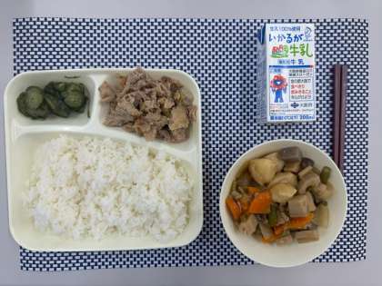 ごはん、豚肉のねぎじょうゆ焼き、ふきよせ煮、きゅうりの赤じそあえ、牛乳