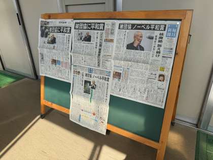今朝の全校集会で話をしたノーベル平和賞受賞を報じた新聞各紙の一面を校長室前に掲示しています。