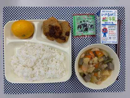 ごはん、みそカツ、じゃがいもと野菜の煮もの、みかん、ソフト黒豆、牛乳