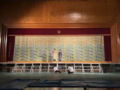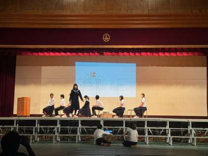 体育館の舞台を使って本番さながらの練習に取り組んでいます。