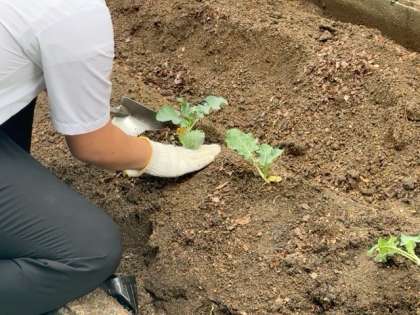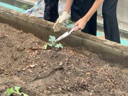 校舎裏の畑を耕して、ブロッコリーの苗を植えています。しっかり面倒を見て、収穫できるようになるといいですね。