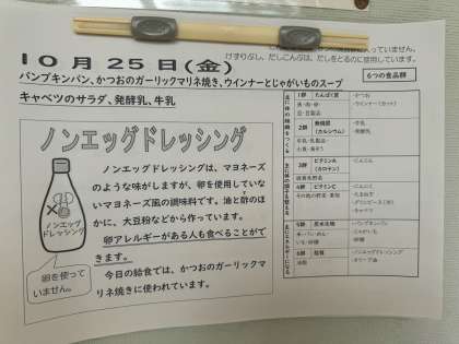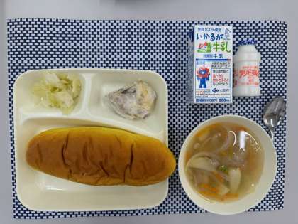 パンプキンパン、かつおのガーリックマリネ焼き、ウィンナーとジャガイモのスープ、キャベツのサラダ、発酵乳、牛乳
