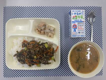 ごはん、もずくと豚ひき肉のジューシー、さつまいものみそ汁、焼きれんこん、牛乳