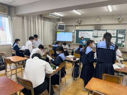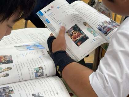 教科書の会話文をペアで読み合う活動に取り組んでいます。