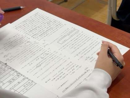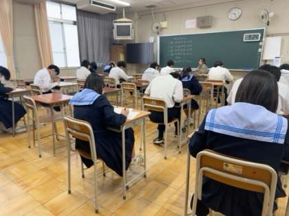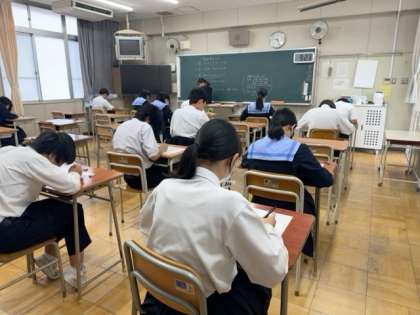本日、3年生は第3回実力テストとなっています。1時間目から5時間目までの5教科のテストが行われています。写真は1時間目の国語のテストの様子です。