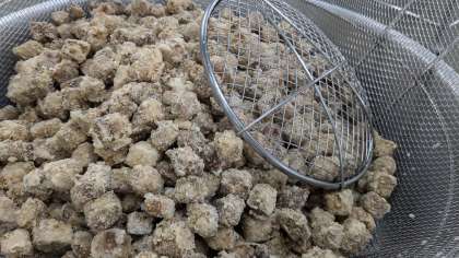カラッと揚げたまぐろのブロックに、赤みそとケチャップで作ったタレをかける人気メニューです。