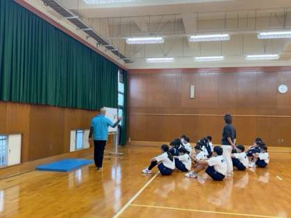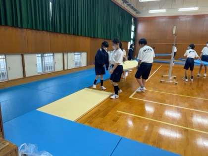 これから柔道の授業に入ります。格技室に畳を敷く作業からはじめています。