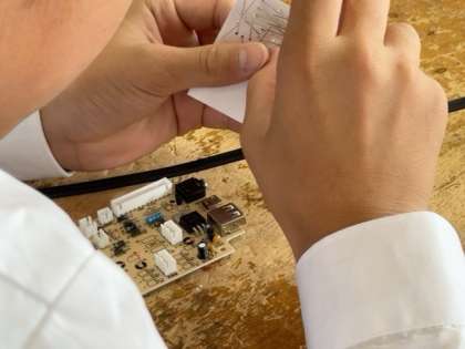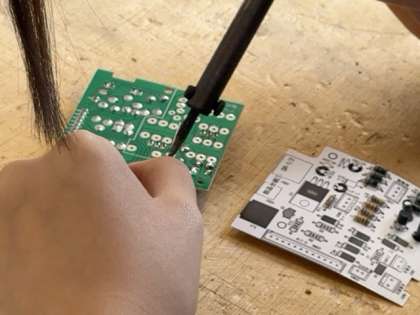 電子回路に電子部品をはんだ付けする作業に取り組んでいます。高温なので気をつけてください!!