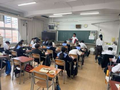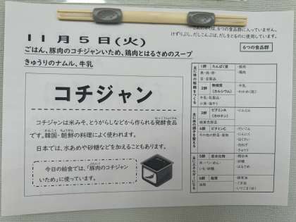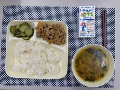 ごはん、豚肉のコチジャンいため、鶏肉とはるさめのスープ、きゅうりのナムル、牛乳