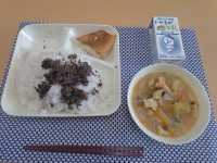 おさつパン、白身魚フリッター、ミネストローネ、ブロッコリーのサラダ、牛乳