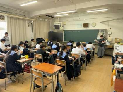 新出単語の発音を全員で確認してから、短時間で覚える学習に取り組んでいます。