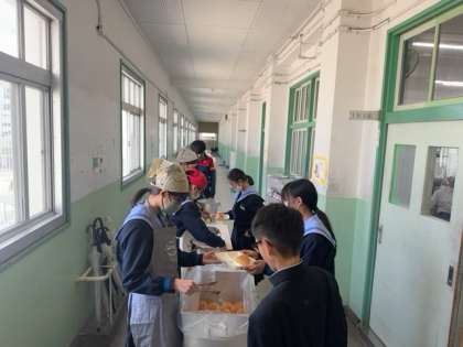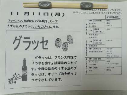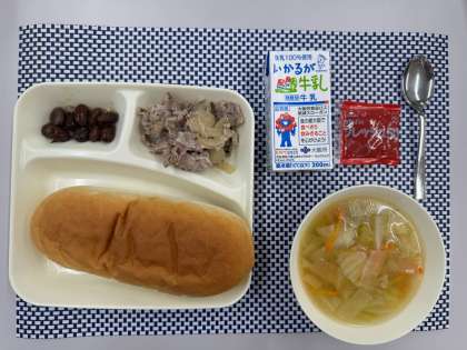 コッペパン、豚肉にバジル焼き、スープ、うづら豆のグラッセ、いちごジャム、牛乳