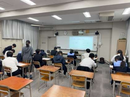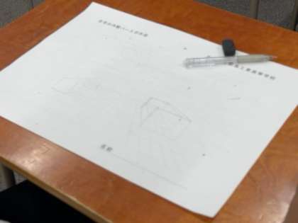 写真は、大阪府立都島工業高校の出前授業の様子です。テーマは、「1点透視図法で描くインテリアスケッチ」です。