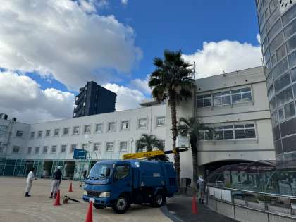朝から、業者の人に来てもらって、高い樹木の剪定をしてもらっています。