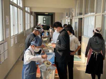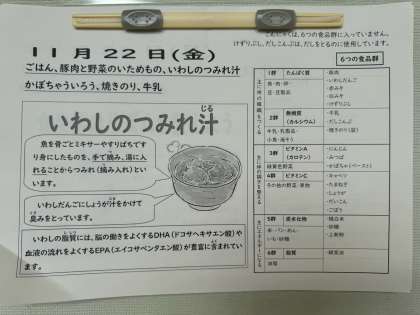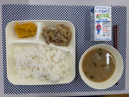 ごはん、豚肉と野菜のいためもの、いわしのつみれ汁、かぼちゃういろう、焼きのり、牛乳