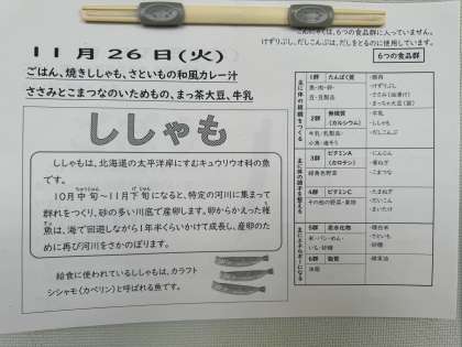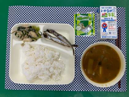ごはん、焼きししゃも、さといものカレー汁、ささみとこまつなのいためもの、まっ茶大豆、牛乳