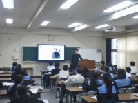 期末テストを振り返って、成果と課題に関する説明を聞いています。