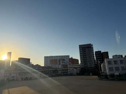 ハルカスの後ろから、綺麗な朝日が上がってきています。