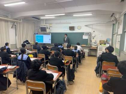 先日、球技大会前にバレーボールの出前授業を行っていただいたクボタスピアーズ大阪のスタッフさんが来校され、1年生に「スポーツマーケティング」に関するお話をしていただきました。