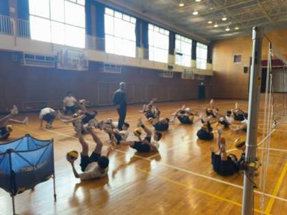 男子は体育館でバレーボール、女子は運動場で持久走に取り組んでいます。