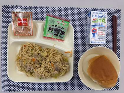 ミニコッペパン、和風焼きそば【かつおぶし】、きゅうりのしょうがづけ、ソフト黒豆、牛乳