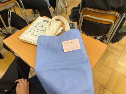裁縫実習で完成したエコバッグのふりかえりを行っています。
