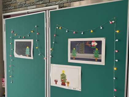 パソコン部のみなさんが玄関にかわいいクリスマスイルミネーションを飾ってくれています。