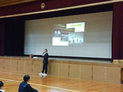 校長先生からは、2学期の行事や取組などをスライドを見ながらふりかえりました。そして、先週の全校集会で予告した校長先生が考える木津中版「今年の漢字」の発表がありました。