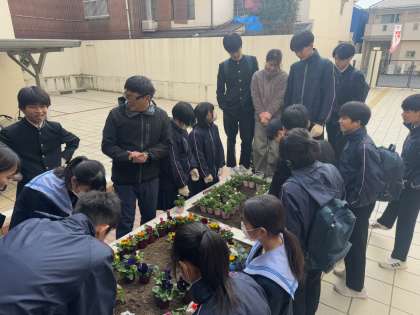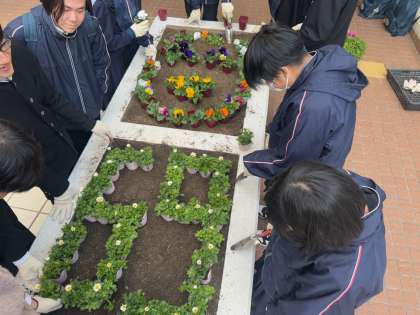 3年生の卒業に向けて、玄関花壇に花を植える取組を行っています。