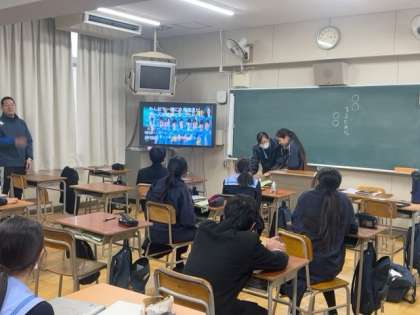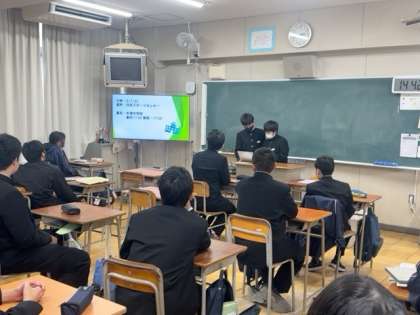 1年生の代表が各教室に来て、クボタスピアーズ大阪の観戦ツアーに関する紹介プレゼンテーションを聞いています。