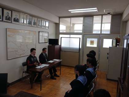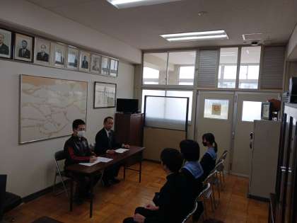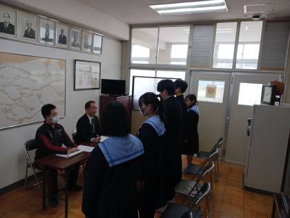 高校等の入試が目前に迫ってきています。学校によっては、面接試験があることから、3年生全員を対象に「校長面接」を行います。数人の集団面接形式で行いました。