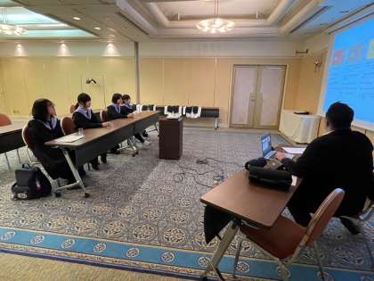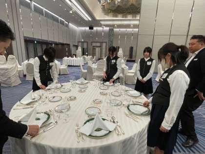 スイスホテルで、ホテルの説明を聞いたり、宴会場のセッティングやお客様の迎え入れを体験したりしています。