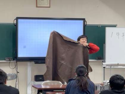 地域のNPO法人であるシューネクストさんに来校していただき、皮革産業のことを聞いたり、実際に革細工に取り組んだりします。