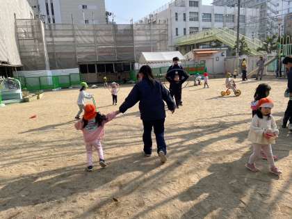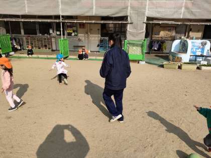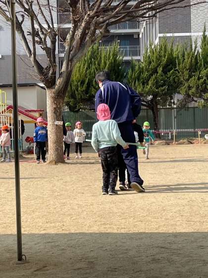 大国保育園では、昨日に引き続いて子どもたちのお世話を体験させてもらっています。互いに慣れてきたことがよく分かります。