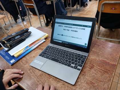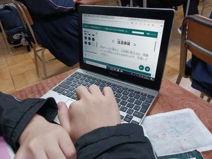 2年生では、来年度4月に行われる「全国学力学習状況調査」の理科のテストがいわゆる「紙のテスト」ではなく、学習者端末を使ってコンピュータに入力するテスト(CBT)となります。そこで、実際の雰囲気を理解するためサンプル問題に取り組んでいます。動作上の問題は特になかったようです。