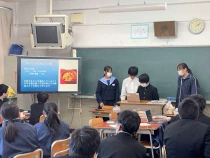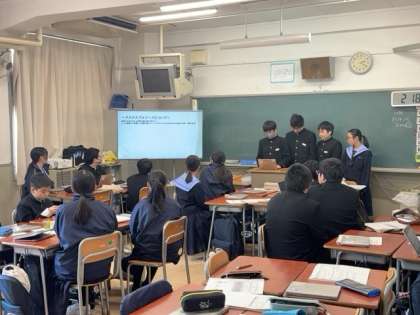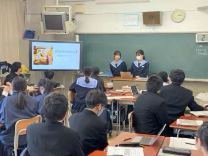 この学習のまとめとして、グループごとで考えた「サスティナブルなランチ」の提案を発表しあいました。これまでのさまざまな取組で、このような機会の経験を積んできたこともあって、発表する側も発表を聴く側も態度よく進めることができました。また内容もよく考えられているものばかりでした。