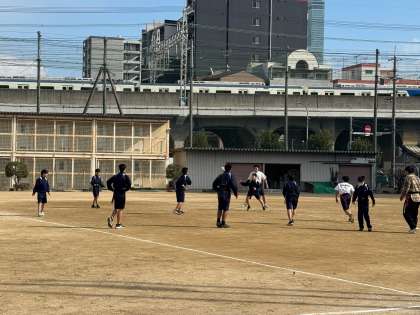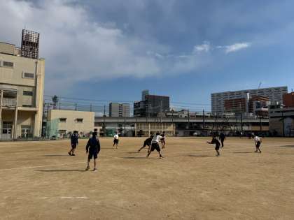 運動場でタグラグビーに取り組んでいます。ゲーム形式の練習です。