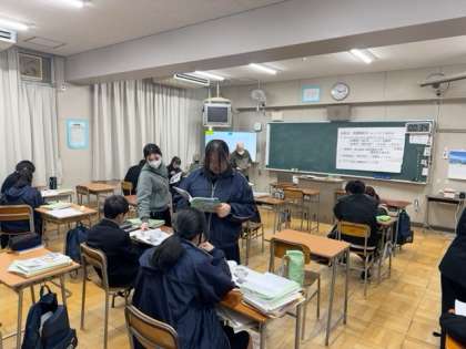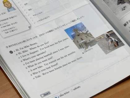 CーNETの先生の授業です。教科書に出てくる会話文をペアで練習しています。