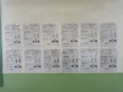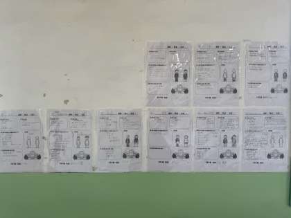 先日、進路学習の一環で取り組んだ「高校調べ」が教室前の廊下に掲示されています。
