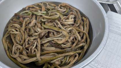 これは今日の煮ものに使われている「干しずいき」を戻したものです。