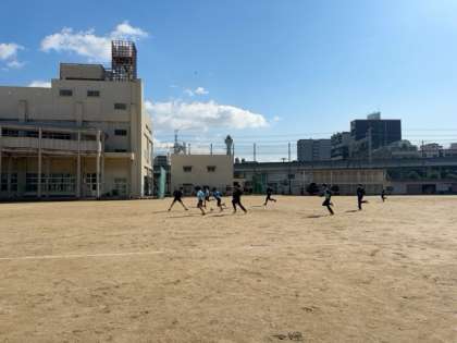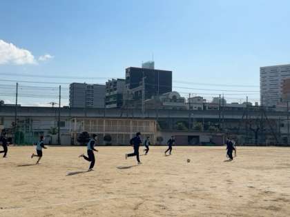 運動場でサッカーに取り組んでいます。寒い中ですが、元気よく声かけあっています。