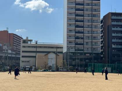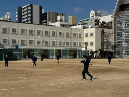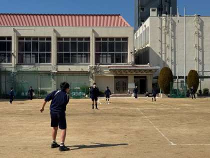 運動場で柔らかいボールを使った「ベースボール5」に取り組むため、キャッチボールなどの基本的な練習に取り組んでいます。