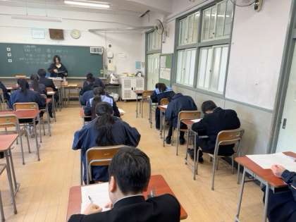 今日から金曜日までの3日間、1年生と2年生は「学年末テスト」になります。1年生の1時間目は、英語のテストが行われています。リスニング問題も含まれています。