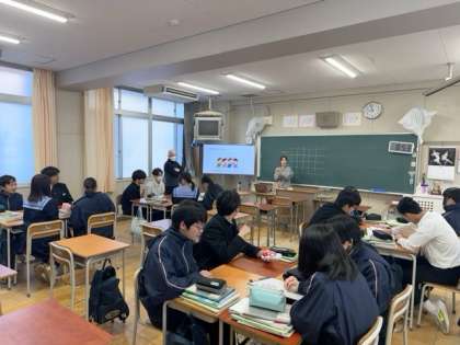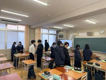 3年生は、1月に学年末テストが終わっているので、今日は5時間目までの通常授業です。英語の授業では、CーNETの先生と英語で「伝言ゲーム」に取り組んでいます。正確な発音と聞き取りで、伝言していくことができたでしょうか?