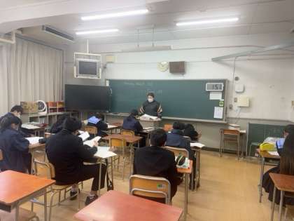先週に行われた学年末テストの解説を聞いています。