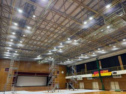 今日の全校集会や体育の授業で気がついた人も多かったと思いますが、先週に体育館のフロアの照明が水銀灯や白熱灯からLED電球にかわる工事が行われました。以前よりも、とても明るい体育館になりましたし、点灯や消灯が自由自在にできるようにもなりました。
