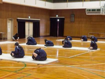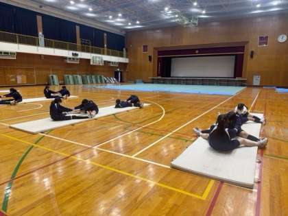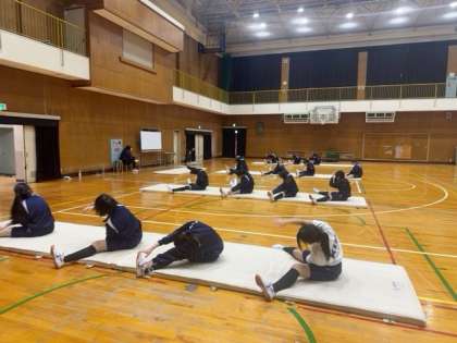 マット運動の授業です。体を柔らかくするため、入念にストレッチをしています。