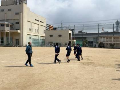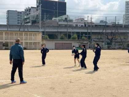 タグラグビーに取り組んでいます。パス練習をしていますが、後ろの人にパスを繋いでいく感覚を掴むのが難しいようです。