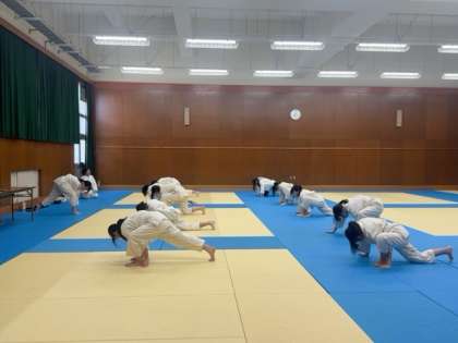 柔道の授業です。胴着を着て、しっかりとストレッチをしてから、受け身の練習に取り組みます。